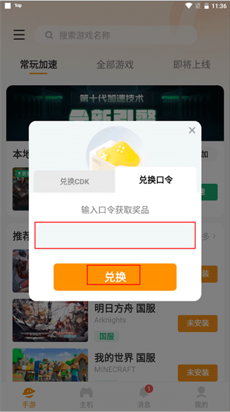 3、从默认兑换CDK切换到兑换口令,输入你早已得到的口令号码,全部输入好后点击下方的兑换按钮即可兑换成功。