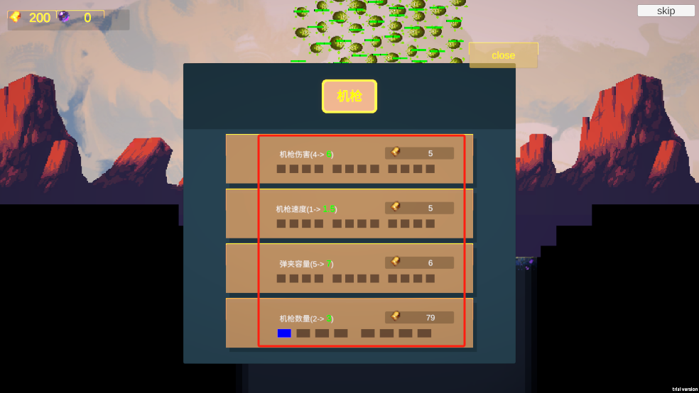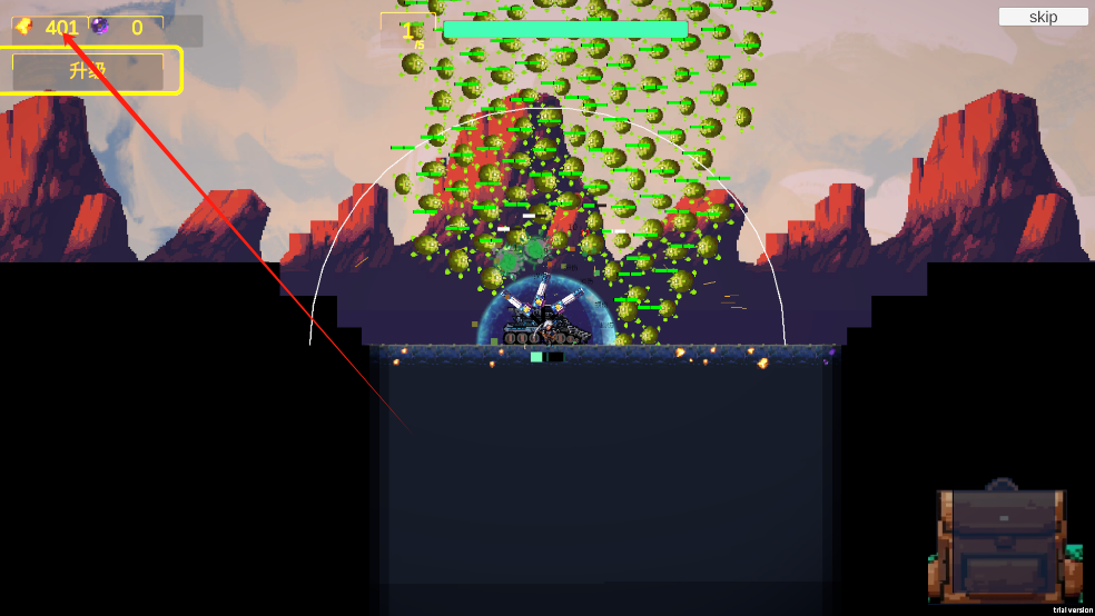 每次击败敌人会掉落金币,用于强化主副武器、增加生命值等各项属性。
