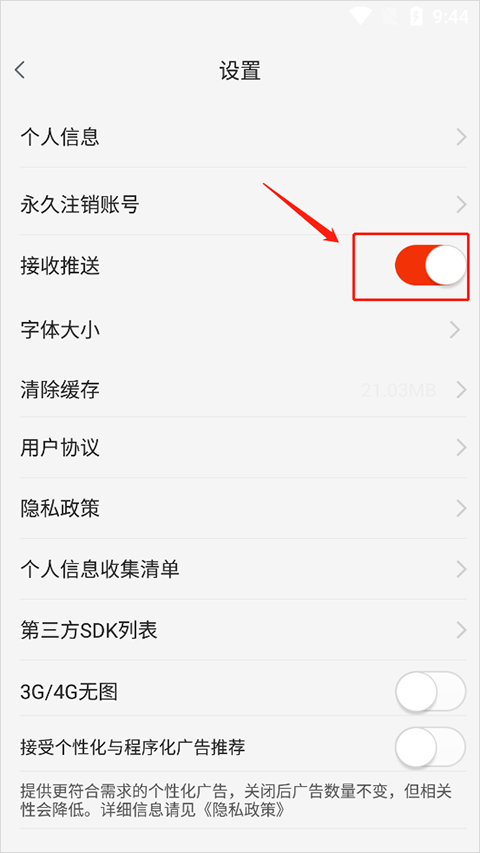 3、在“设置”页面把这个接收推送的开关打开就可以了。