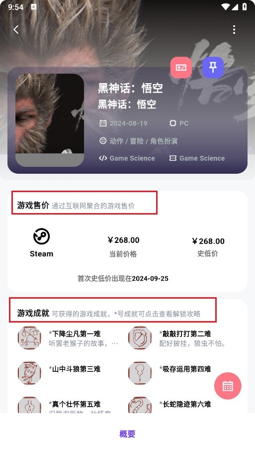 3、点进游戏封面进入到该游戏的详情页,这里可以浏览到游戏在某平台的售价,可以查看游戏攻略成就。