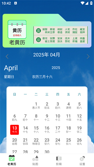 天天老黄历最新版是一款实用性强、界面简洁的日历类应用,集农历查询、公历农历双向换算、节气节日提醒、宜忌事项参考等功能于一体。用户可快速掌握每日吉凶宜忌、时辰吉凶、生肖运势等传统信息,还能同步节假日安排与生活小贴士。