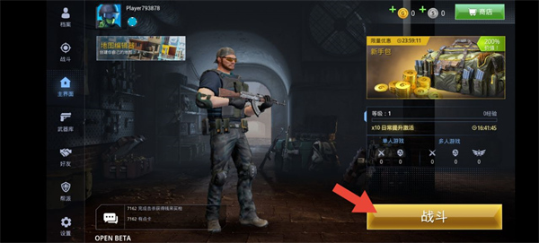 启动游戏后直接进入主战场界面,点击“战斗”按钮即可开启联机入口。