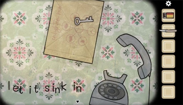 初入房间,目光所及是静默的桌、垂落的听筒、半掩的柜子与镜中晃动的异样倒影。信封封口严密,电话吐出无序字符,花盆里埋着一支未燃的蜡烛,窗外风景僵硬如画——撕开它,祭坛裸露,四枚烛台空荡待命。钟表指针可调却锁住下方抽屉,密码盒机关需精准旋转与滑动才能开启。刀片划开信封,纸条浮现“让自己变身”;火柴擦亮瞬间,天花板簌簌落下;咸鱼摆上托盘,暗门应声裂开——第一重空间就此松动。