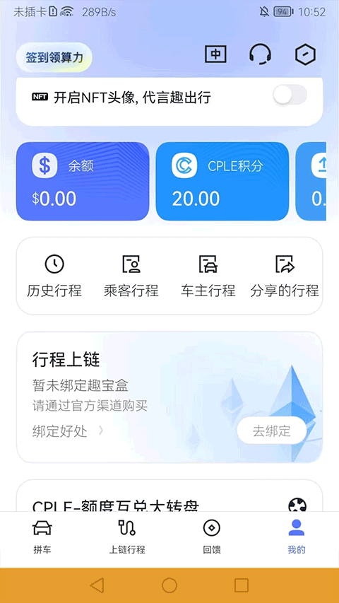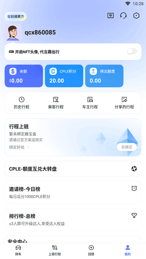 打开趣出行app最新版,点击右下角“我的”,完成手机号验证后即可进入主界面。