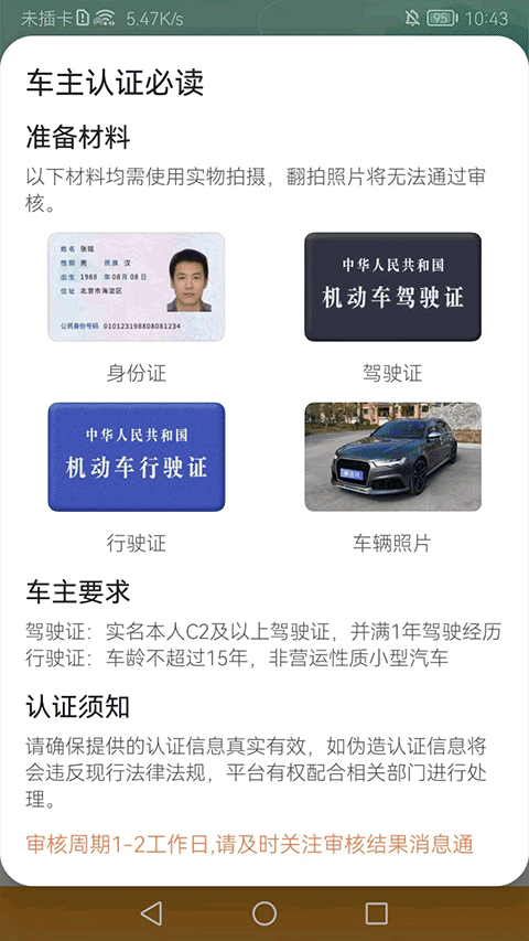 按提示上传驾驶证、行驶证及身份证正反面照片,审核通过后即可发布自己的常用路线,等待乘客预约。