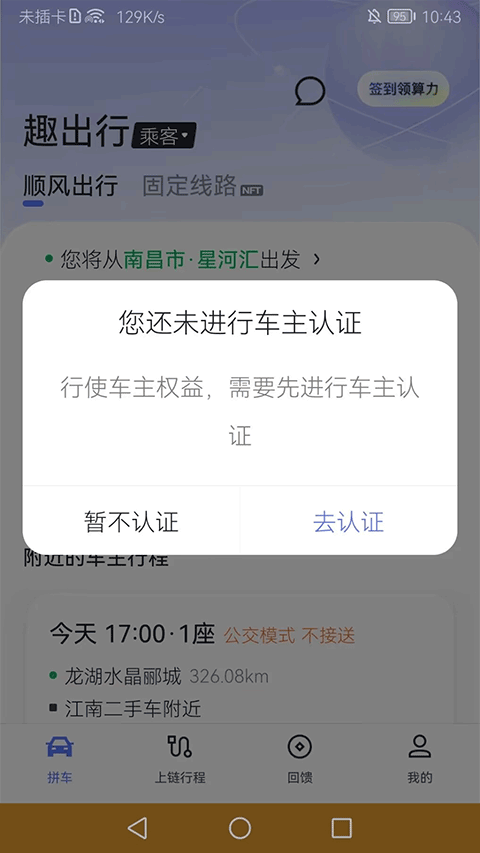 有意愿成为车主的用户,可在拼车页切换至“车主”模式,进入资质认证流程。