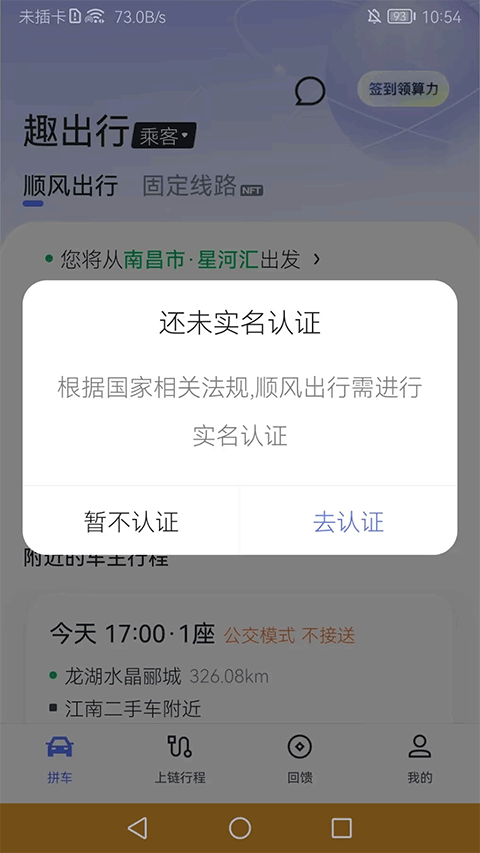 首次使用需完成实名认证,填写身份证信息并配合活体人脸识别,认证通过后即可查看完整拼车列表。