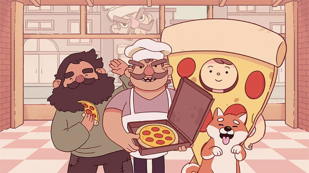 画面采用手绘质感的轻快风格,食物泛着油光,蒸汽袅袅升腾,连顾客嚼东西的小动作都带着喜感。没有沉重压力,只有热气腾腾的生活气息。