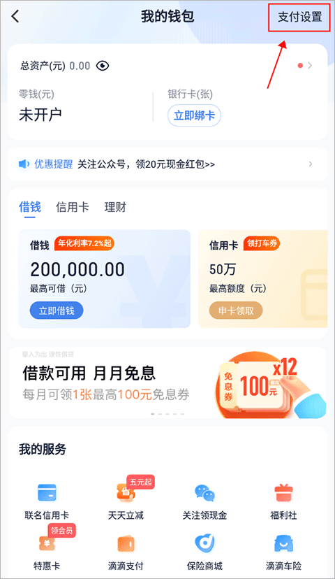 打开“我的”页面,进入“钱包”模块,右上角点击“支付设置”,找到“免密支付”选项。