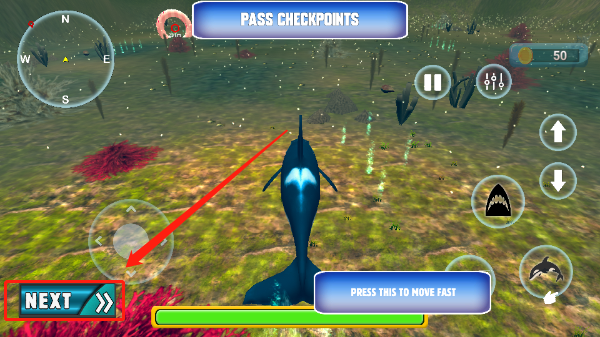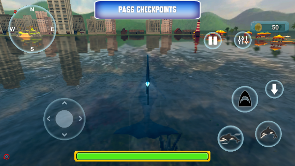 左侧虚拟摇杆掌控游动方向与节奏,右侧按键赋予动作灵魂:喷射气柱震慑敌群、腾空跃起甩开追击、猛然俯冲咬住要害。