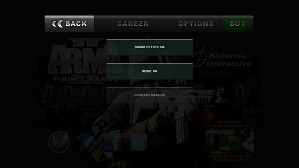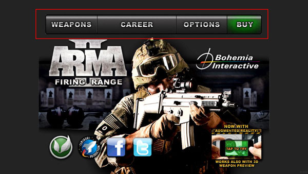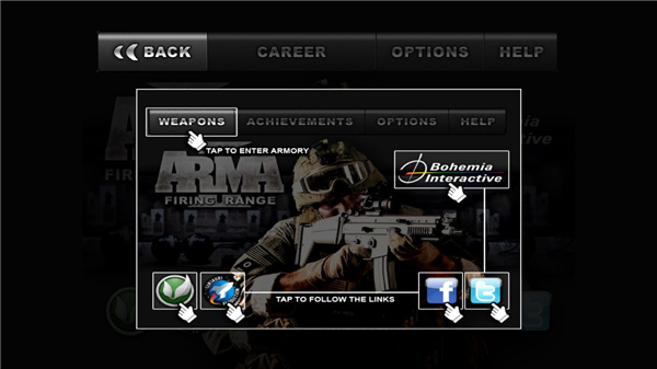 启动武装突袭2手机中文版后,主界面呈现简洁功能分区:【WEAPONS】用于预设战斗配置,【CAREER】开启主线征程,【OPTIONS】调节画面与操作灵敏度,【BUY】解锁扩展内容。建议新手优先进入【WEAPONS】,根据任务类型搭配主副武器、弹药基数与战术配件,完成个性化战备。