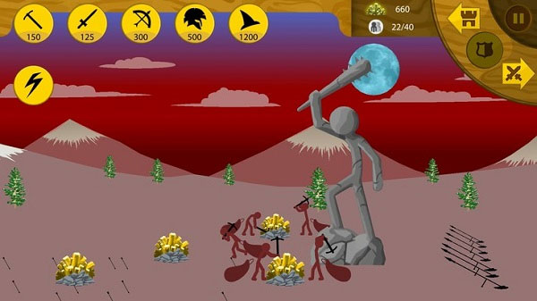 点击左上角“锄头”图标即可部署采矿火柴人,他们拖着麻袋奔向矿区,持续输送矿石资源。资源充足后,才能召唤战斗单位发起进攻。