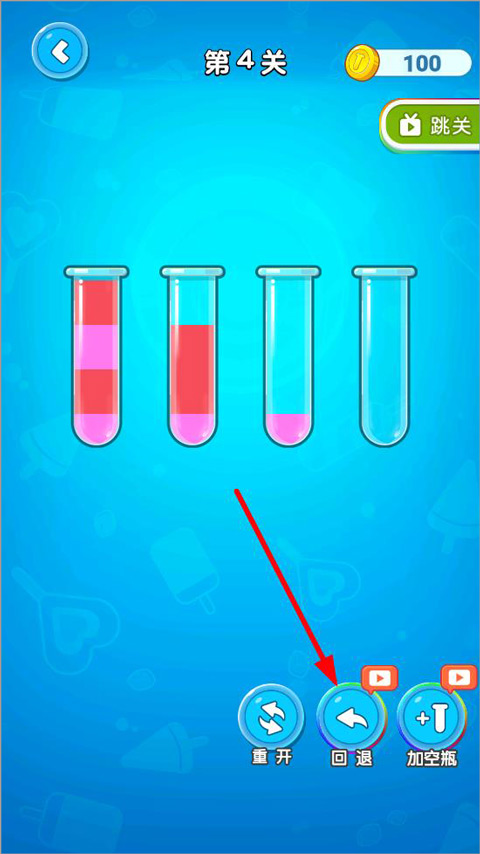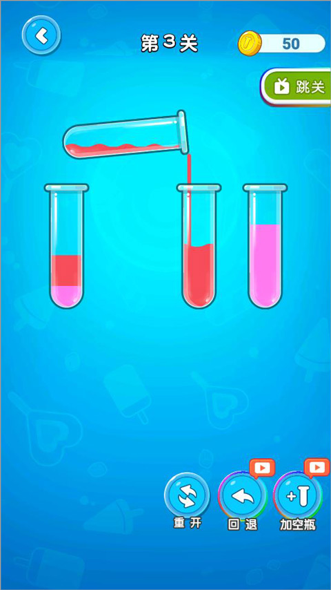 点击某支试管后,系统自动识别其顶部连续同色液段,轻触目标空管即可完成转移;若该空管已有同色液体且未满,会直接叠加。