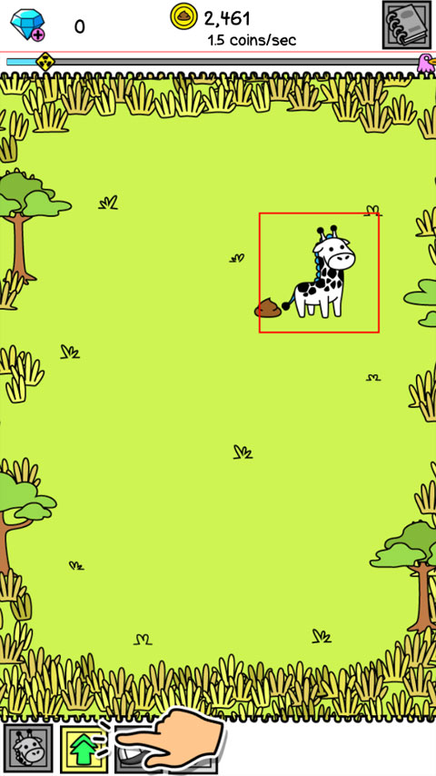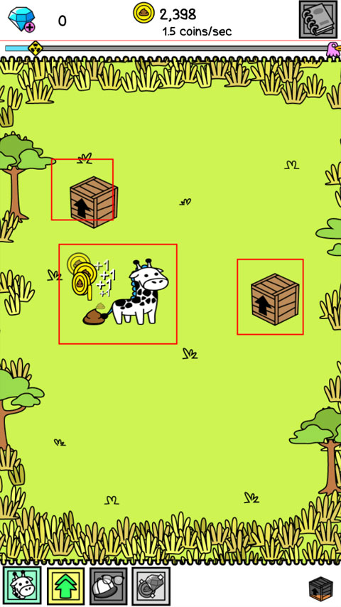 开局点击中央箱子,随机获得初始长颈鹿,它会安静伫立并周期性产出金币