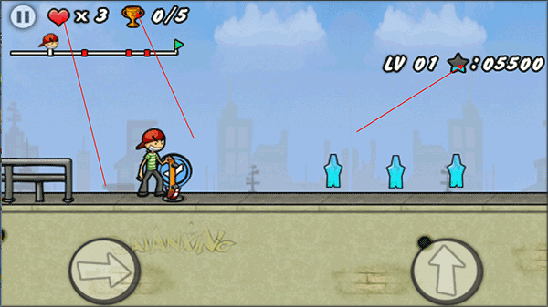 屏幕左上角跳动的红心是容错机制,不是传统意义上的生命值,每次失误(如撞墙、跌落、动作中断)会消耗一颗,但成功衔接动作可回补;奖杯象征关卡通关资格,五角星则是隐藏评分点,藏在斜坡尽头、管道内壁或广告牌背面。