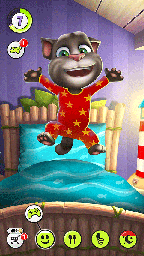 玩家可以通过喂食、洗澡、玩耍等方式照顾汤姆猫,提升它的快乐值和健康值。