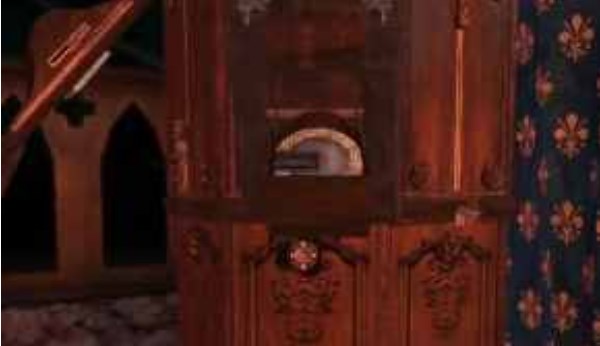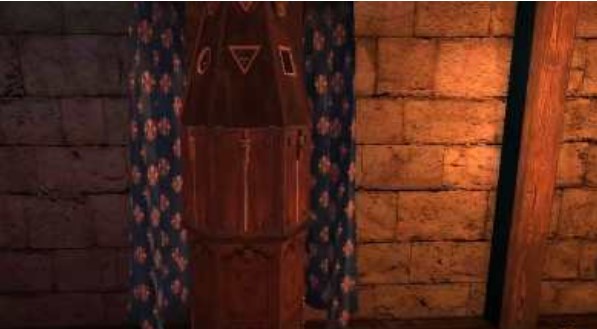 前往中央木桌,将公羊头嵌入凹槽,取得雕花金属手柄;返回帷幔前的主木构,插入手柄并旋转,整套联动结构开始运转。
