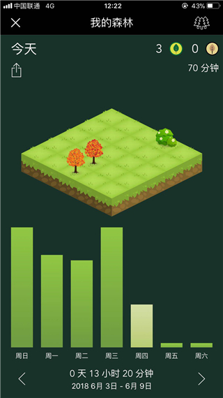 右上角森林图标支持切换周、月、年维度,总专注时长与成长曲线并行展示,让你看见自己如何一天天变得更沉得住气。