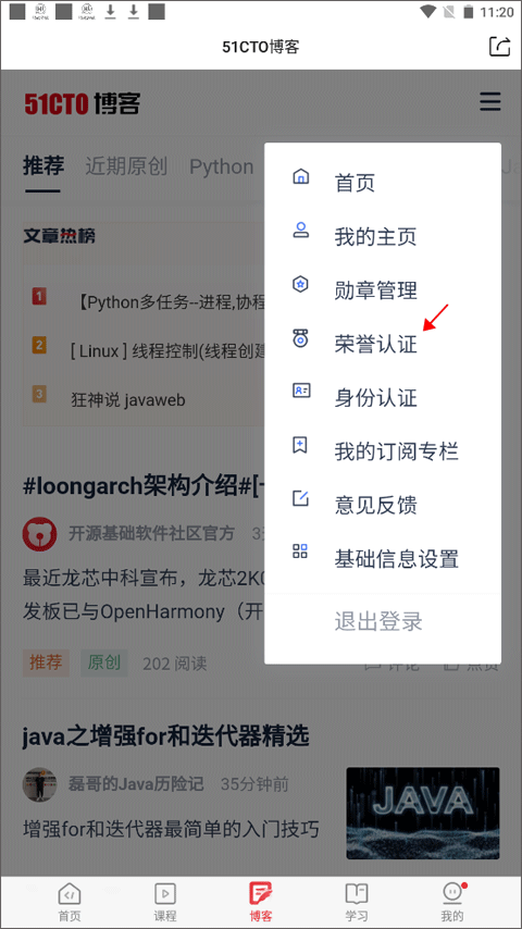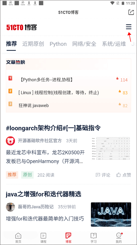 切换到底部导航栏【博客】,点击右上角三横图标唤出功能菜单。