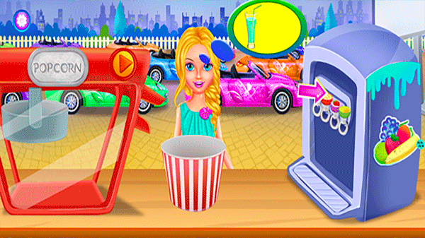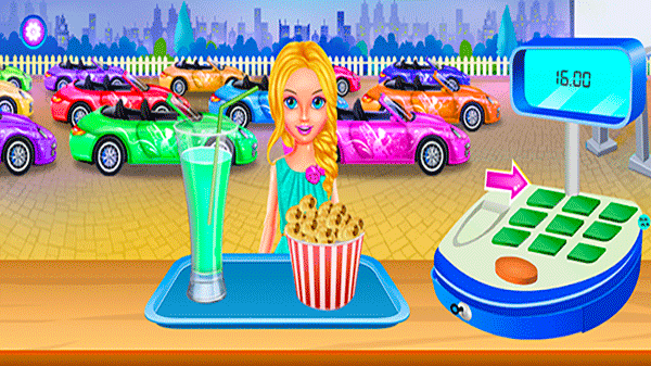 在小卖铺场景中,顾客会点单制作饮品或现烤爆米花,孩子需按提示顺序点击原料、启动设备、等待完成,再将成品递出。