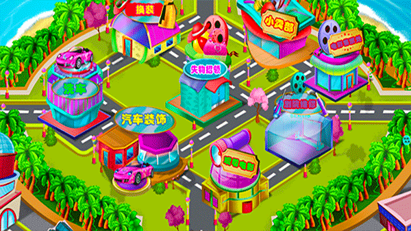 启动后主界面呈现多个生活场所图标,包括洗车点、影院入口、零食铺等,点击即可切换场景进入不同服务模式。