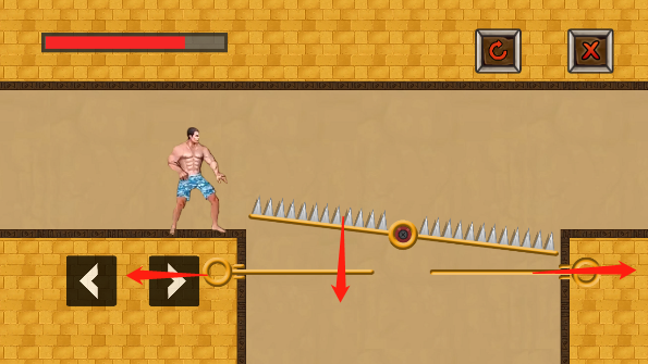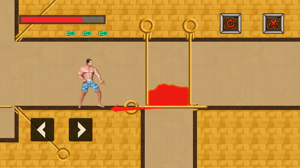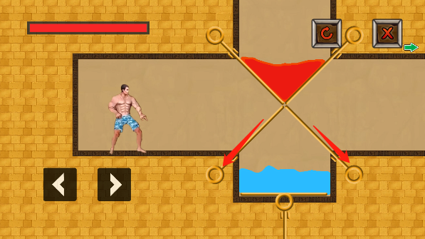 初入第一关,先向下抽出水池上方的拉环,再拔掉顶部悬垂的指针,让水流顺势灌入岩浆槽,冷热相激,危机自解。