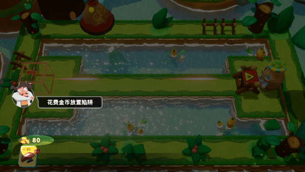 把金币往地上一丢,陷阱自动落位。弹簧弹飞、风扇转向、喷火口轰鸣——布置过程干脆利落,毫无拖沓。