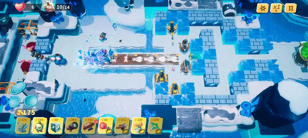 开局别急着铺满,先在右侧高地放下冰雪机器人稳住前两波,弓箭塔架在路口正前方,中间位置埋一枚弹簧,等野人靠近时一弹三飞。