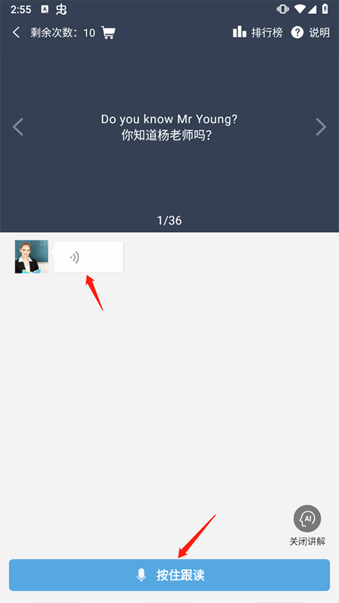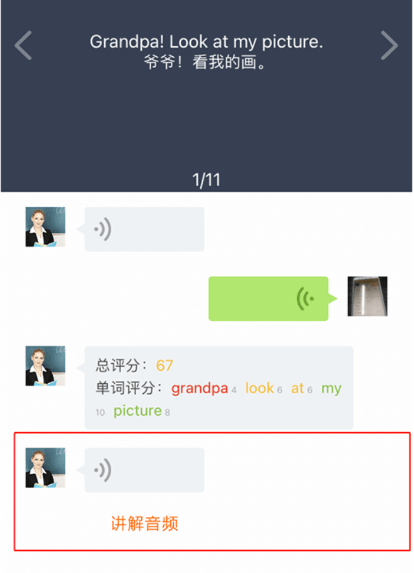 先完整收听一遍标准音频,再点击下方话筒图标开始跟读,系统自动录音比对。