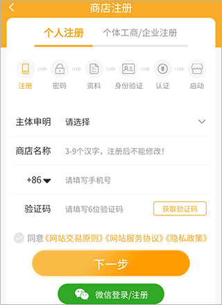 根据实际经营性质选择个体或企业主体,填写店铺名称、联系手机号并完成短信验证,后续按页面指引完善资料即可开通专属书摊;