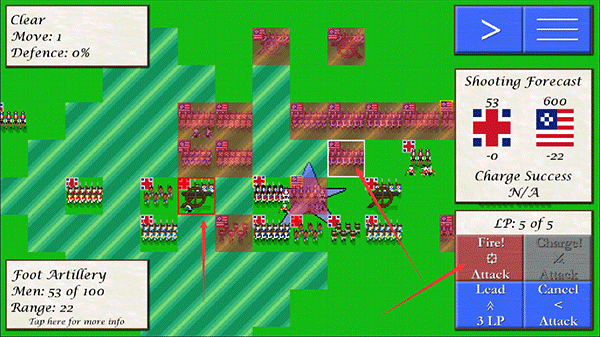 当敌军进入红色扇形攻击范围,选中己方单位,再点敌方目标,界面弹出“Fire”按钮,点击即触发射击动画与伤害结算。