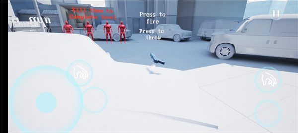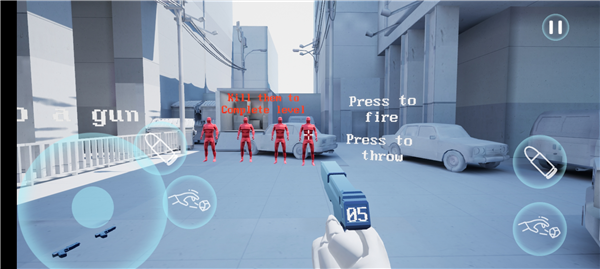 持枪后界面浮现双功能按钮:射击与投掷,准星可自由拖拽锁定目标,射击反馈干脆利落。