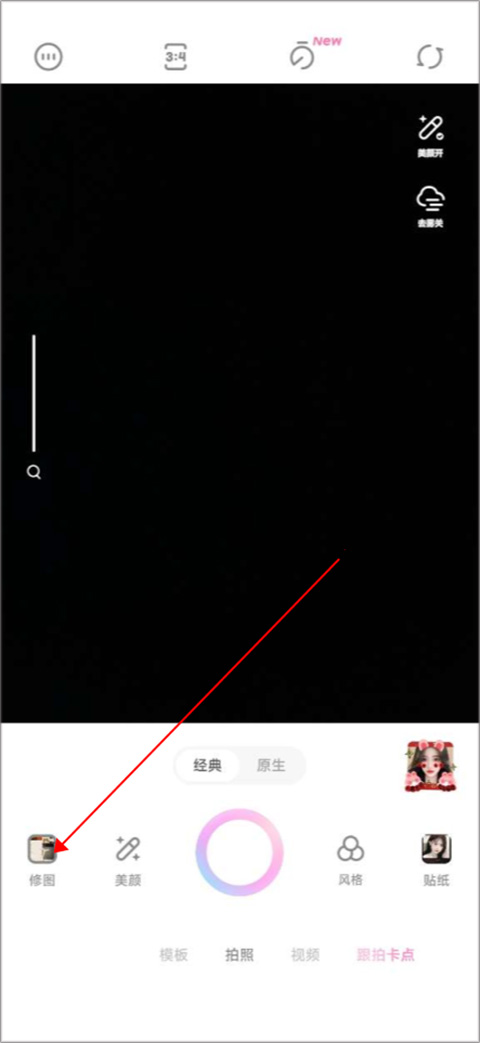 打开应用后进入修图模块,点击左下角修图按钮启动编辑流程。