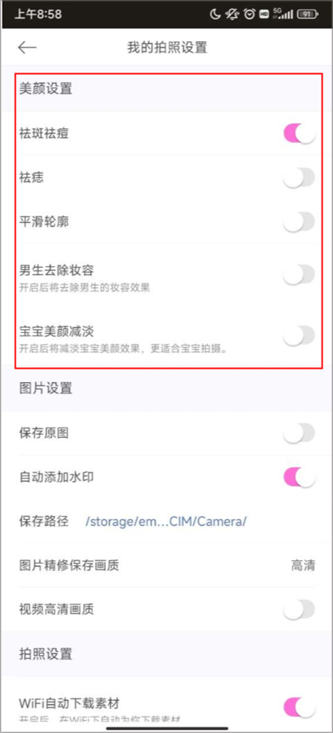 进入美颜参数页,根据当下需求开启或关闭磨皮、瘦脸、大眼、美白等单项效果,并可拖动滑块精细调节强度。