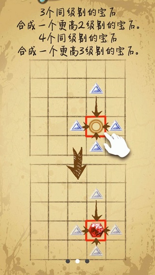 选定一个空格点击,相邻四个方向上无遮挡的同级宝石将沿直线滑向该位置,抵达即爆裂融合;