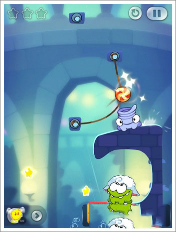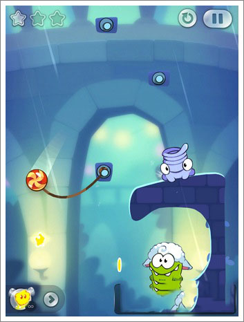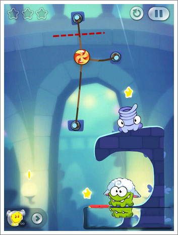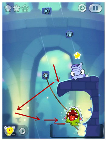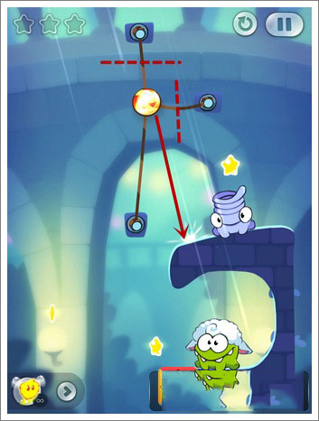 此时果断割断支撑绳,糖果下坠途中快速连点Blue三次,改变其运动矢量,引导糖果斜向飞出。