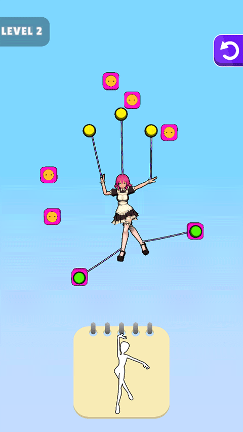 观察屏幕底部的示范剪影,用手指从一个关节滑向另一个关节,拉出代表提线的亮色轨迹。