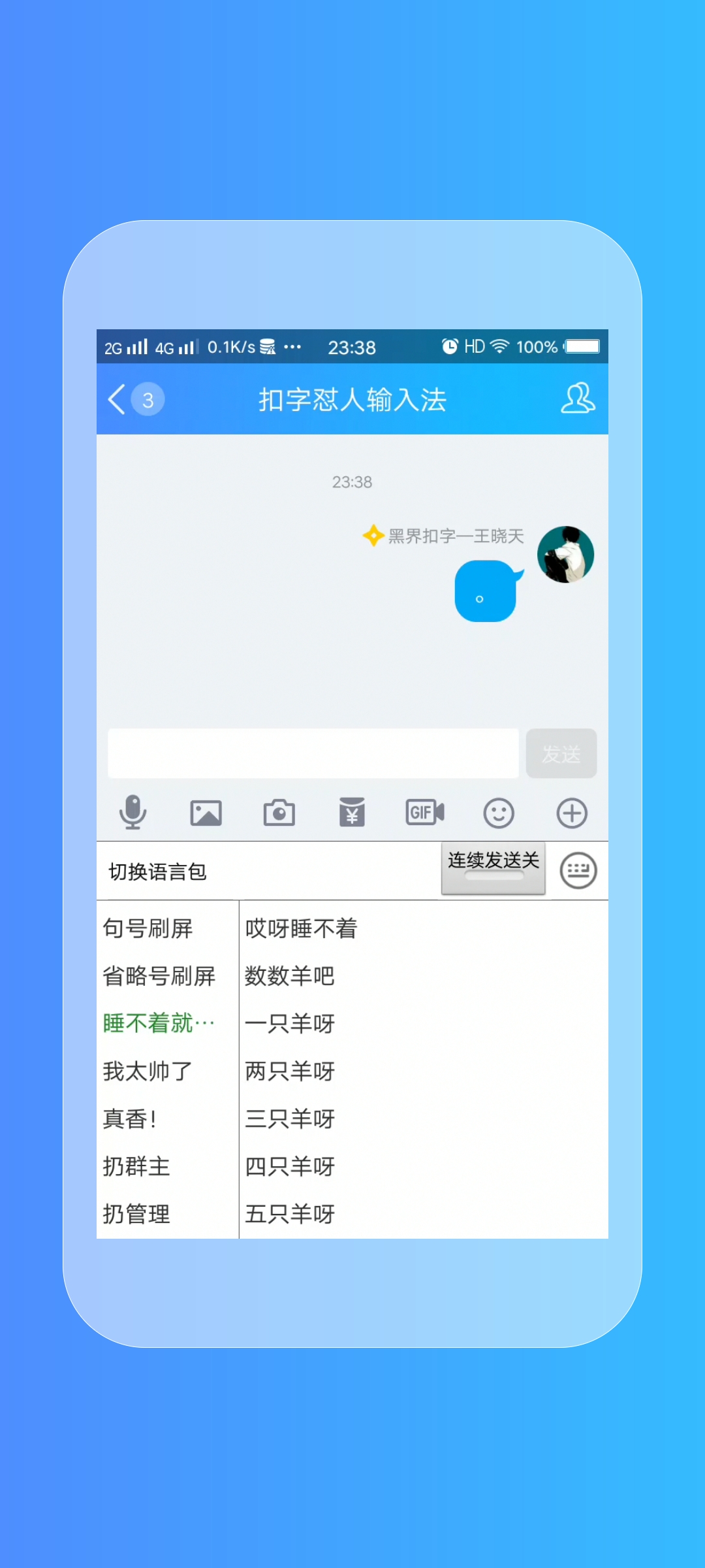 打开任意可输入界面,调出键盘,点击地球图标切换至扣字怼人输入法。输入触发词,候选栏立刻浮现预设内容,点一下即发送。全程零延迟,连打三句都不卡顿。