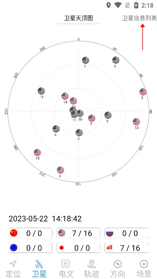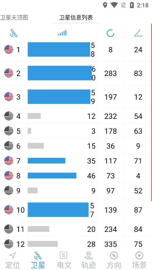 球形天幕图直观展现各颗卫星在天空中的实时位置,点击右上角列表图标,调出详细卫星档案,包含PRN编号、所属星座、轨道高度与信号质量评分。