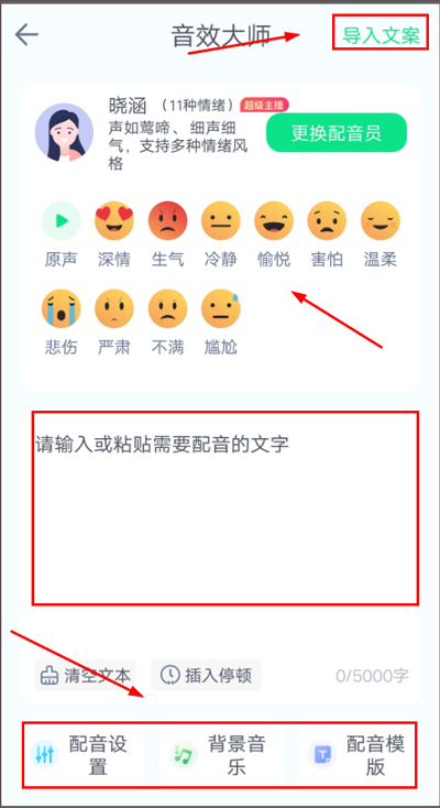 输入配音文案,或从相册/文件中导入文本;随后调节语调倾向、语速快慢、停顿节奏,并可叠加轻量级背景音乐。