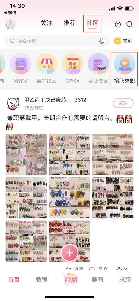 打开美甲帮app,底部导航栏切换至“社区”,在顶部栏目中找到并点击“招聘求职”入口。