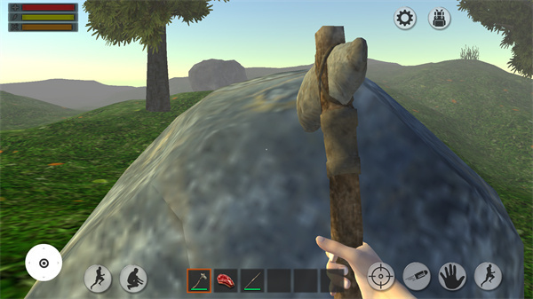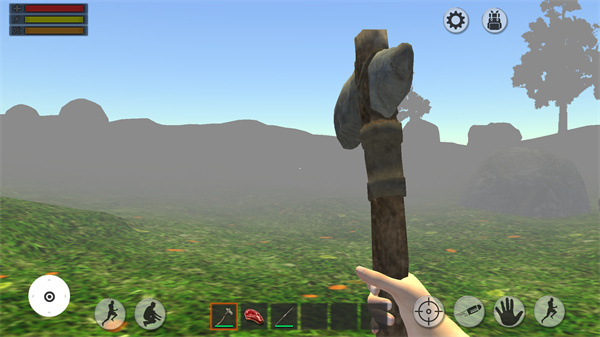 安装启动后,初始背包仅含一把石斧、几块生肉和一支长矛,一切都要从最基础的砍伐与采集起步。