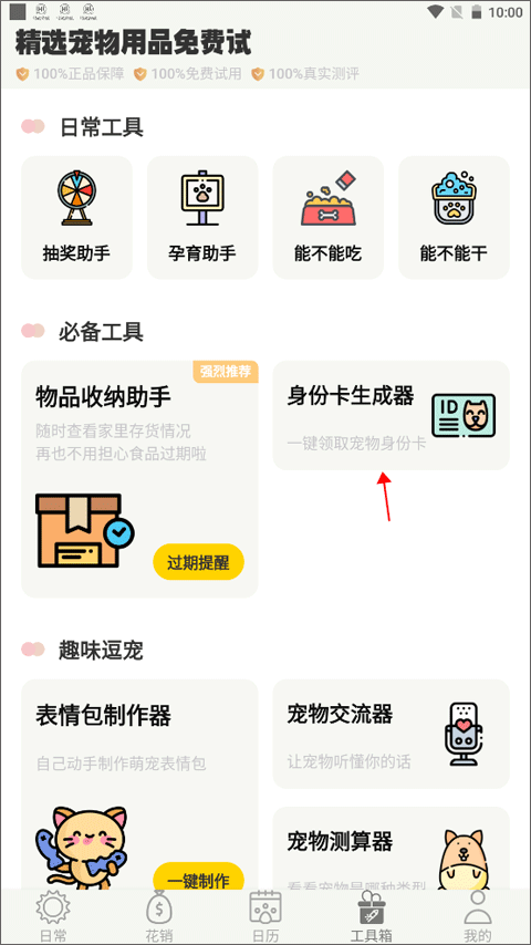 切换至工具箱→必备工具,找到“身份卡生成器”。选定目标宠物后,点击“一键生成”,系统自动整合姓名、品种、出生日期等核心信息,生成一张具备辨识度与纪念意义的电子身份卡。