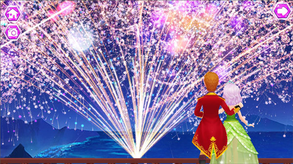 舞毕,画面自然过渡至露台场景,月光洒在两人肩头,远处烟火升腾不息,轻点屏幕可触发不同主题焰火序列,如极光流彩、金箔漫天、蝶影翩跹等。