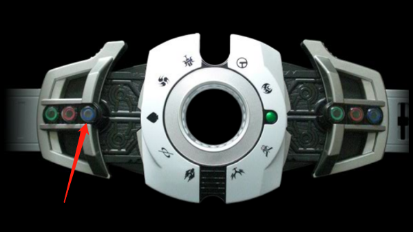 按压右侧红色组装键,腰带两侧金属结构铿锵闭合,内部齿轮咬合声清晰可闻,随即爆发标志性变身音效,光芒由弱渐强笼罩屏幕。
