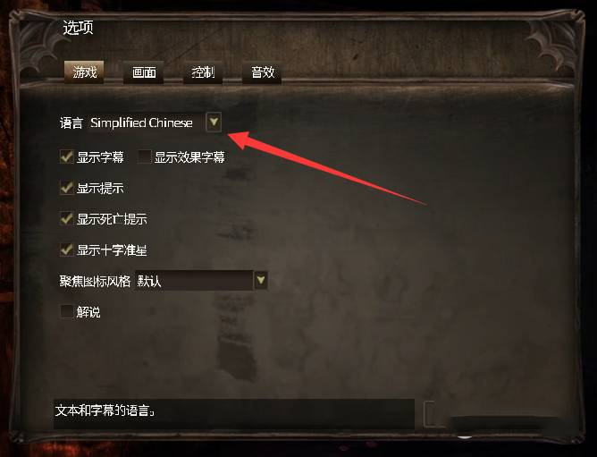 在“游戏”设置页中找到语言选项,下拉选择simplified chinese(简体中文)即可生效。