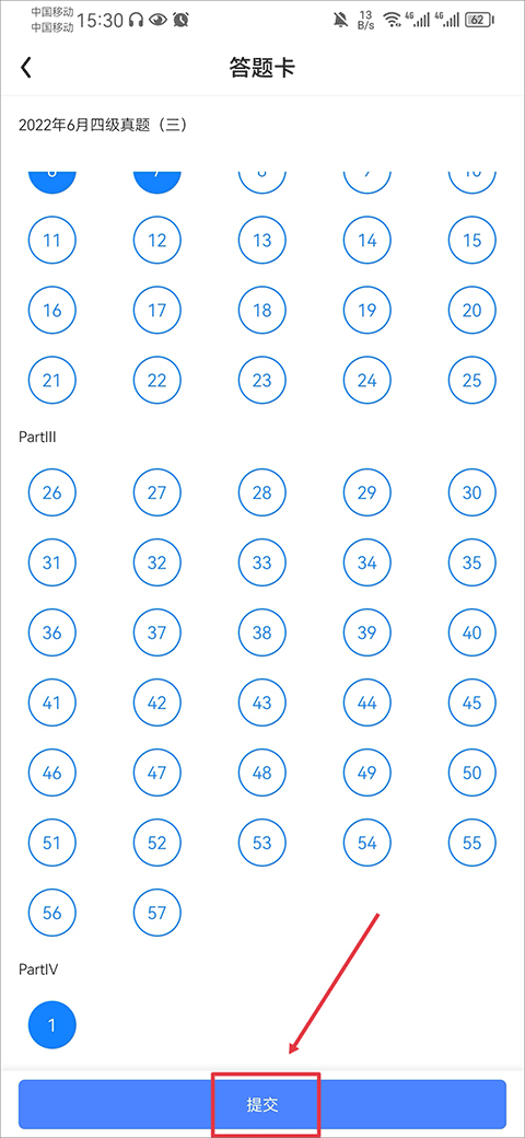 在模考页面选择目标考试级别,如四级或六级历年真题试卷。