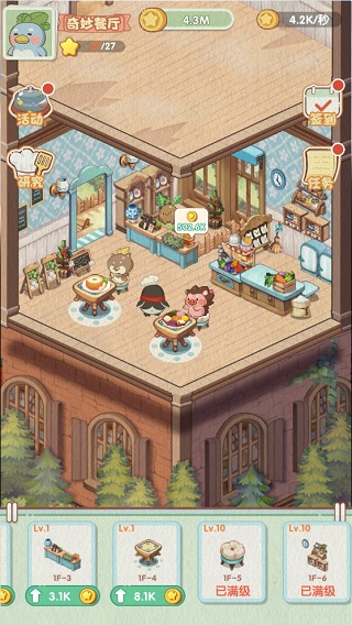 初始阶段只需在底部菜单选购基础装潢,即可开启营业。后续依靠经营所得持续投入,逐步将各项设施升至最高等级