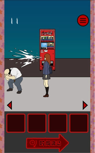 女主先迈步前进,待其走到饮料摊前再放置面包。她取食后转身买饮,此时黑影恰好靠近,被喷溅而出的液体击中面部,短暂失衡。