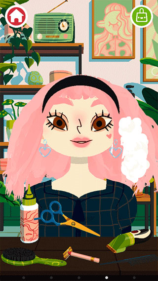 若某处剪得过短,不必重开一局,点击红色生发剂瓶即可快速补救,发量瞬间恢复,继续下一步创作毫无阻碍。
